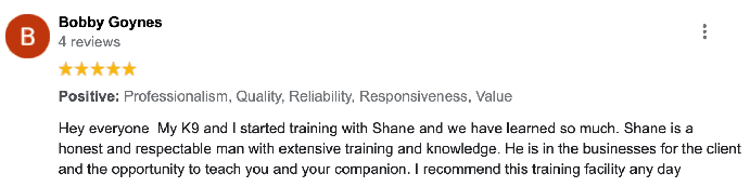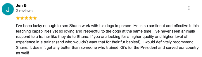 The main benefit in Private 1-2-1 Training compared to Board and Training is that you are involved in the training. We actually teach you to become a competent dog trainer! We learned many years ago that the most effective way to generate long lasting results in canine behavior is when we train the owner to become a dog trainer! Believe it or not, it’s simple to train any dog, the challenge is actually in the owner maintaining the behavior by practicing our techniques and drills every day. As an Ex-Presidential K9 Handler I have developed a system where I can train you to be a dog trainer within a matter of just a few short weeks and you only need just 10 minutes a day to maintain the long lasting transformation we will create with you and your dog!